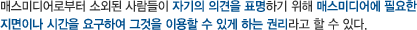 Çѱ¹ÀÇ ÆÛºí¸¯ ¾×¼¼½º´Â ±× ¿ª»ç°¡ ªÁö¸¸, ±×µ¿¾È ¿ì¸® »çȸÀÇ ±×´ÃÁø °÷, ¼Ò¿ÜµÈ »ç¶÷µéÀÇ ¸ñ¼Ò¸®°¡ ¼ÒÅëµÉ ¼ö ÀÖ´Â Áß¿äÇÑ °ø°£À¸·Î ÀÚ¸®¸Å±èÇϰí ÀÖ½À´Ï´Ù. ¹°·Ð ¿©ÀüÈ÷ ¸¹Àº »ç¶÷µéÀÌ ÀڽŵéÀÇ ¹Ìµð¾î¿¡ Âü¿©ÇÒ ¼ö ÀÖ´Â ÆÛºí¸¯ ¾×¼¼½º ±Ç¸®°¡ ÀÖ´Ù´Â °ÍÀ» ¸ð¸£°í ÀÖ½À´Ï´Ù. ¼³·É ÆÛºí¸¯ ¾×¼¼½º¸¦ ¾Ë°í ÀÖ´õ¶óµµ Àåºñµµ ¾ø°í ¹Ìµð¾î±³À°À» ¹ÞÁö ¸øÇÏ¿© ¿©ÀüÈ÷ ¹Ìµð¾î¿¡ Á¢±ÙÇÏÁö ¸øÇÏ´Â °æ¿ìµµ ¸¹½À´Ï´Ù. °æÁ¦ÀûÀÎ ÀÌÀ¯·Î ¹Ìµð¾î¿¡ Á¢±ÙÇϰí Âü¿©ÇÒ ¼ö ÀÖ´Â ±Ç¸®°¡ Á¦ÇѵÇÁö ¾Êµµ·Ï ÆÛºí¸¯ ¾×¼¼½º ÇϰíÀÚ ÇÏ´Â »ç¶÷µéÀ» À§ÇØ ±âÀÚÀç¿Í ±³À°À» ¹ÞÀ» ¼ö ÀÖ´Â ±âȸ°¡ Á¦°øµÇ¾î¾ß ÇÕ´Ï´Ù.