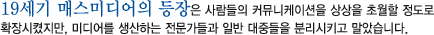 ´ëÁßµéÀº ¼ÒºñÀÚ, ½ÃûÀÚ¶ó´Â ¼öµ¿Àû À§Ä¡¿¡¼ ½Å¹®, TV, ¶óµð¿À, ¿µÈ°¡ ½ñ¾Æ³»´Â ¸¹Àº Á¤º¸µéÀ» ¹Þ¾ÆµéÀÌ´Â ¿ªÇÒ¿¡ ¸¸Á·ÇØ¾ß Çß½À´Ï´Ù. ±×¸®°í ÀÌ ¸Å½º¹Ìµð¾î ½Ã´ë¿¡´Â Ä¿¹Â´ÏÄÉÀ̼ÇÀÇ Àǹ̰¡ Á֯ļö¸¦ Àß Ã£´Â °Í, È¥¼±À» ¾ø¾Ö´Â °Í, ä³ÎÀ» ´Ã¸®´Â °Í, ÈÁú ÁÁÀº TV¸¦ ±¸¸ÅÇÏ´Â ÀÏ µîÀÇ ±â¼úÀûÀÎ ¹®Á¦·Î ÀÎ½ÄµÇ°Ô µÇ¾ú½À´Ï´Ù.
