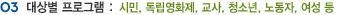 ÀÏÁ¤½Ã±â ¿µ¿ªº° ÇÁ·Î±×·¥¿¡ ´ë»óÀ» Á¦ÇÑÇÏ¿© ÀÌ¿ëÀÚ °£ÀÇ ¿¬´ë¼º°ú ±³À° ¸ñÇ¥ÀÇ ¸íÈ®¼ºÀ» È®º¸ÇÕ´Ï´Ù. |