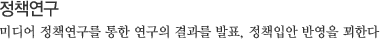 ±×¸®°í ¹Ìµð¾î °ø°ø¿µ¿ª¿¡ ´ëÇÑ Ã£¾Æ°¡´Â Á¤Ã¥ ¿¬±¸¸¦ ÅëÇØ »çȸÀû ÀÇÁ¦È¸¦ ²ÒÇÏ¸ç ½ÇõÀ» Á¶Á÷Çϰí ÀÌ·ÐÀ» Á¤¸³ÇØ ³ª°©´Ï´Ù. ÀÌ·¯ÇÑ ¿¬±¸ÀÇ °á°ú¸¦ °¢Á¾ ¼¼¹Ì³ª¿Í Åä·Ðȸ ¹× ¹ßǥȸ¸¦ ÅëÇØ ¹ßÇ¥Çϰí Á¤Ã¥ÀԾȿ¡ ¹Ý¿µÇϱâ À§ÇÑ ³ë·ÂÀ» Çϰí ÀÖ½À´Ï´Ù. ¶ÇÇÑ Àü±¹ÀûÀÎ ¹Ìµð¾î¿îµ¿ Ȱµ¿°¡µéÀÇ ³×Æ®¿öÅ©¸¦ ±¸ÃàÇÏ°í °¢ Ȱµ¿ ¿µ¿ªÀÇ Àü±¹Àû ³×Æ®¿öÅ©¸¦ Ȱ¼ºÈÇϱâ À§ÇÑ ÇöȲ Á¶»ç ¹× ³×Æ®¿öÅ© ¿öÅ©¼óÀ» ¸Å³â ÁøÇàÇϰí ÀÖ½À´Ï´Ù. ¿Ü±¹ÀÇ ¹Ìµð¾î¼¾ÅÍ °ü°èÀÚ ¹× ¹Ìµð¾î Á¤Ã¥ Àü¹®°¡µé°úÀÇ ±¹Á¦ Åä·Ðȸ¸¦ ÅëÇØ ±¹³»¿Ü ¹Ìµð¾î ¿îµ¿ÀÇ °æÇèÀ» ±³·ùÇÏ¸é¼ »õ·Î¿î ÀÇÁ¦¸¦ ¼³Á¤Çϰí ÀÌ¿¡ ´ëÇÑ ÇØ°áÃ¥À» ¸¶·ÃÇÏ´Â µîÀÇ ±¹Á¦ÀûÀÎ ¿¬´ëȰµ¿ ¿ª½Ã ÁøÇàÇÕ´Ï´Ù.